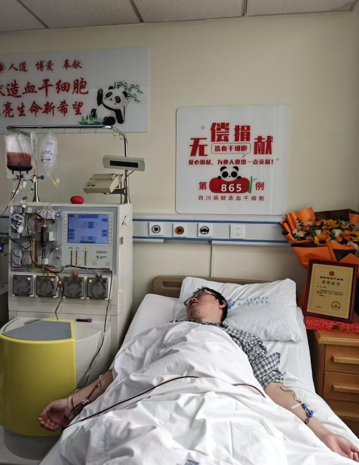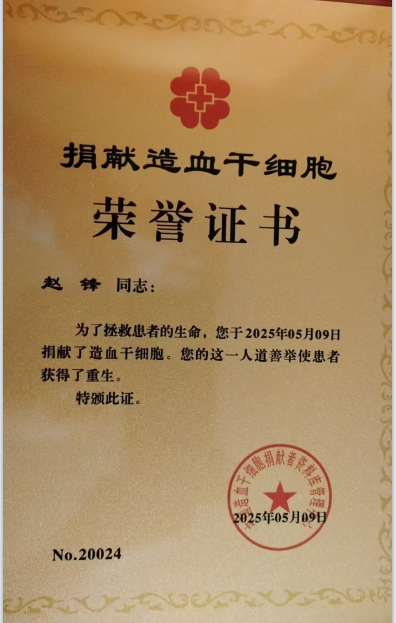 2025年3月,赵锋同志与上海一名血液病患儿初次配型成功。在随后的捐献准备过程中,他及其家人全力配合,顺利完成了二次配型、体检等系列工作。根据中华骨髓库安排,赵锋同志于5月5日至10日在四川省人民医院进行造血干细胞采集,其中5月5日至9日注射动员剂,5月9日至10日正式实施采集。