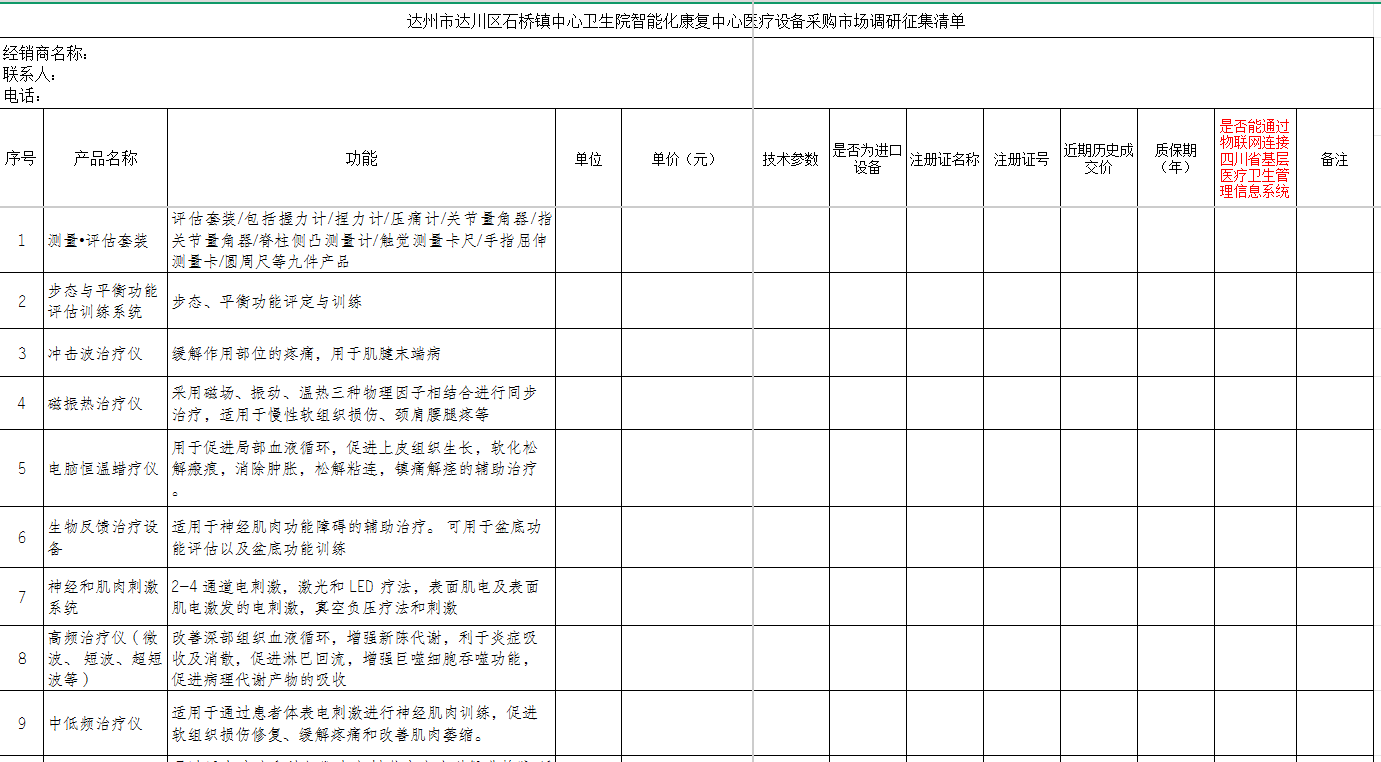 为提升我院中医针灸理疗科诊疗服务能力,推进达川区石桥镇中心卫生院智能化康复中心建设工作,现面向社会公开开展项目建设市场调研工作,欢迎符合条件的供应商积极参与。具体事项公告如下: