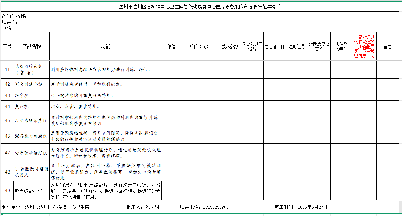 2、递交方式:以书面形式密封市场调研资料(包括供应商资格条件承诺函、其他必备的资质、医疗设备市场调研征集清单、设备安装房间改造方案、信息化联通方案等)提交达川区石桥镇中心卫生院门诊楼二楼副书记办公室。同时,需提交pdf盖章版 可编辑word版电子版资料(u盘或光盘形式)一份。