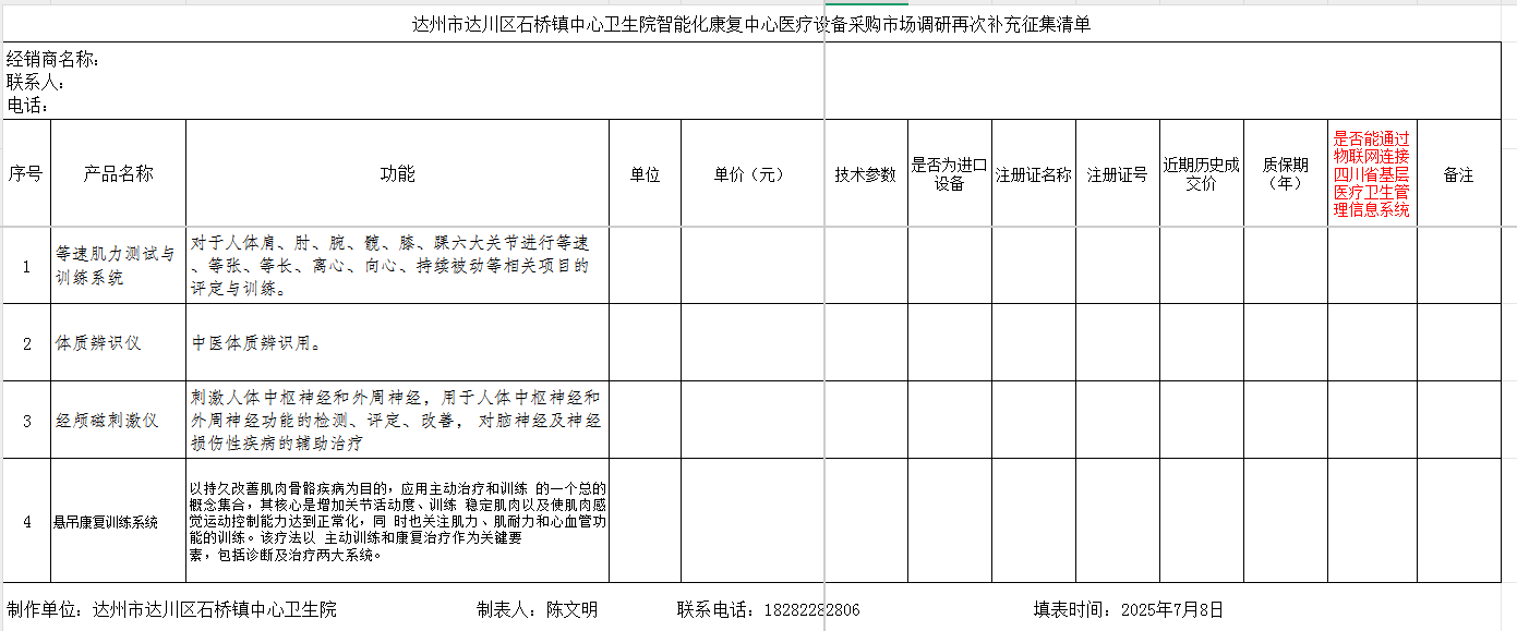 为提升我院中医针灸理疗科诊疗服务能力,推进达川区石桥镇中心卫生院智能化康复中心建设工作,现面向社会公开开展项目建设市场调研工作补充公告,欢迎符合条件的供应商积极参与。具体事项公告如下: